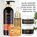 Infused with powerful ingredients such as glutathione, collagen, niacinamide, carrot oil, and shea butter, the formula helps reduce dark spots, freckles, and uneven skin tone while supporting natural collagen production. The papaya brightening soap gently cleanses while promoting skin clarity, while the serum and lotions lock in long-lasting moisture and nourishment. With consistent use, this set supports diminishing the appearance of sunspots, age spots, and discoloration, leaving skin soft, smooth, and luminous.